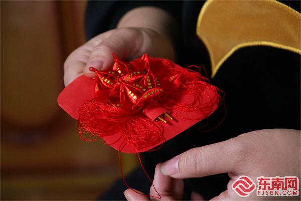 小小的“婆婆花”蘊含著許多吉祥的寓意。 東南網(wǎng)記者 鄒玒攝 “比如‘婆婆花’,正中間的石榴象征著多子多福,小葉子代表‘開枝散葉’,兩旁的‘面線須’代表老人福壽綿長,挖耳勺是‘婆婆花’必備的,表示媳婦娶進門,婆婆可以安心享福了。同時要注意的是,‘婆婆花’有前有后,‘前’在閩南話中有‘財’的意思,在普通話中與‘錢’諧音?!焙闀澡ふf,小小的一對花,需要講究的地方非常多,“新娘花”中的“雙石榴”元素也包含了早生貴子、一世幸福的美好寓意?!霸谖覀冞@里,春仔花的品類非常多,無論紅事還是白事,都能見到它的身影”。 洪曉瑜的母親洪素珍四十多歲時,便開始為洪曉瑜準備結婚用的春仔花了,在她看來,每一根線也代表著她對女兒的牽掛?!爸两裎疫€留著媽媽送我的春仔花?!焙闀澡ふf。 一根線 串聯(lián)洪厝代代傳承