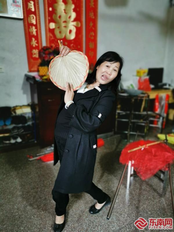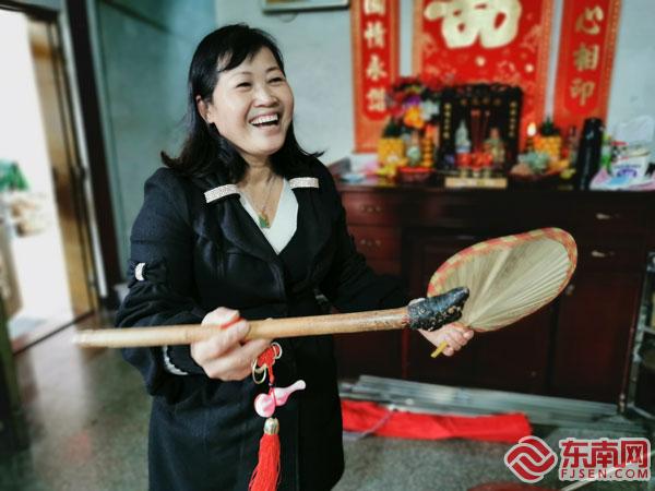 吳潤珠向記者展示“火鼎公婆”所用的煙斗和蒲扇。東南網(wǎng)記者 謝玉妹 攝 “火鼎婆”的裝扮一般較為夸張,濃妝艷抹的臉上點(diǎn)著一顆蜘蛛狀的媒婆痣,寓意“知足常樂”;頭上帶著閃亮的珠飾,插著夸張的大花;身上穿著寬袖闊腿的艷麗衫褲;腳著軟底繡花布鞋,手持大圓蒲扇,一揮一舞間,逗趣的媒婆形象就出來了?!盎鸲鳖^戴圓帽,身穿馬甲褂子和寬筒褲,腳著黑布鞋,手拿長旱煙管。雖然裝扮沒有“火鼎婆”那么夸張,但兩者風(fēng)格保持一致,一前一后,顛而不狂,癡而不醉,十分和諧,也十分詼諧。 吳潤珠告訴記者,每次參加表演,他們都是自帶裝備,自行化妝。經(jīng)過幾十年的歷練,現(xiàn)在,吳潤珠完成整套“火鼎婆”的裝扮,僅需半個小時(shí),“火鼎公”就更快了。 火鼎公婆的表演因時(shí)因地而定,時(shí)間可長可短,有的僅需幾分鐘,民俗踩街活動則大部分都要一小時(shí)以上,長的甚至要跟七、八個小時(shí)?!耙?yàn)槭菑念^到尾都要動起來,所以常常一場表演下來,骨頭都不是我們的了?!北硌蓦m然需要耗費(fèi)大量體力,但吳潤珠總是不知疲倦,越跳越開心。圍觀觀眾的肯定、贊賞和有趣的互動,都會讓她跳得更賣力。 “他們開心,我們就開心?!彼说目隙ê妥陨淼呐d趣成了吳潤珠把這份事業(yè)堅(jiān)持做下去、做大的動力。 百年傳承 多人拜師學(xué)藝