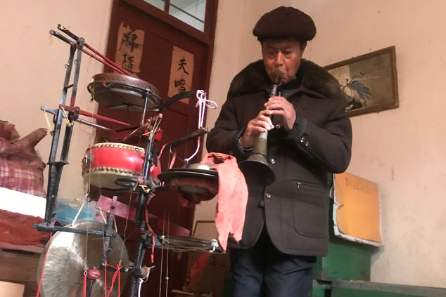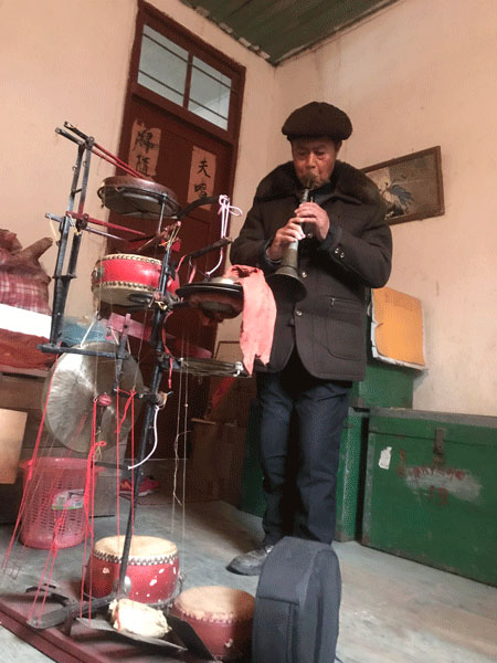虞東生演示“絕活”。劉建飛攝 “我試著把大鑼、小鑼、大鼓、小鼓、叫鑼、鈸和板等樂器焊接到一套道具上,自已做‘獨(dú)門樂器’。像這樣,一邊用腳踩擊大鑼、小鑼、大鼓、小鼓、叫鑼、鈸和板,一邊用嘴吹笛子或嗩吶?!庇輺|生一邊說,一邊擺弄著他的“獨(dú)門樂器”。 “工具做出來后,練就 ‘絕活’還得靠自己。剛開始練的時(shí)候非常難,不是忘了手就是忘了腳,總是配合不好。但是我堅(jiān)持每天都練,練到腳打抖,抬腳都難。”就這樣足足練了四個(gè)月,虞東生的“絕活”終于練成了。他一人能攬下6個(gè)人的活,同時(shí)演奏8 種樂器,成了“一心多用”的器樂手。中央、省、市多家媒體都曾對他這一絕活進(jìn)行報(bào)道。 虞東生還有另一個(gè) “絕活”——飾演《天官賜?!防锏奶旃?。每當(dāng)鄉(xiāng)村開新臺(tái),這個(gè)節(jié)目是必上的。節(jié)目里只有天官一人主唱,其他十三個(gè)演員圍著天官轉(zhuǎn)。能扮演天官的都是德高望重的老藝人,除現(xiàn)年90歲的老前輩劉明外,村里只有虞東生能演天官?!斑@么多年,只有我會(huì)在開新臺(tái)時(shí)表演?!闭f到此事,虞老頗為自豪。 潛心譯舊譜 教徒弟傳承文化