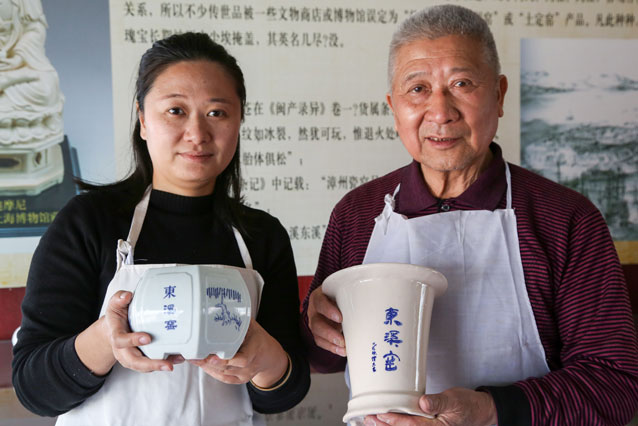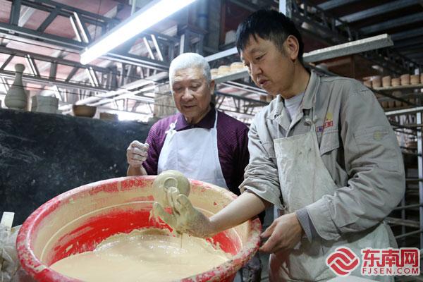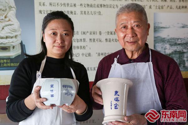 林俊和他的女兒林瑩展示東溪窯瓷器成品。 莊偉杰攝 此外,林俊的兒女林瑩、林濤也繼承了這一事業(yè),學(xué)習(xí)東溪窯傳統(tǒng)燒制技藝,這讓林俊對(duì)這門(mén)技藝的未來(lái)有了更多的信心和底氣。 當(dāng)然,傳承和發(fā)展東溪窯文化及其傳統(tǒng)燒制技藝,林俊他們并非孤身奮戰(zhàn)。2016年7月,國(guó)家文物局把東溪窯遺址列為“海上絲綢之路·中國(guó)史跡”申遺名單,此后,南靖加快了推進(jìn)東溪窯申遺工作的腳步:2018年7月,建設(shè)面積1400平方米、展示實(shí)物500件(套)的南靖東溪窯博物館揭牌開(kāi)館;2019年6月,“海絲”·南靖東溪窯封門(mén)坑保護(hù)性設(shè)施建設(shè)工程完工,為更好地傳承和保護(hù)東溪窯傳統(tǒng)燒制技藝提供了重要保障。