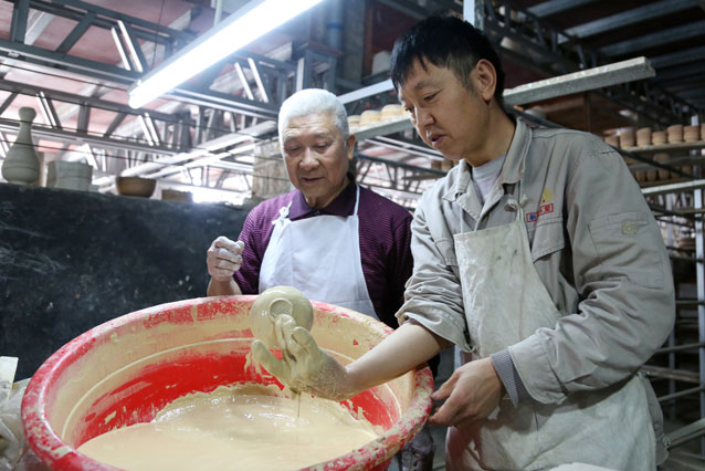 林俊檢查陶土情況。 莊偉杰攝 要制作出精美絕倫的藝術(shù)品,不僅設(shè)備要“古早”,制作技藝也得講究傳統(tǒng)。在漳州古陶瓷工藝研究所里,直徑3米的古老水車(chē)、30米長(zhǎng)的水池、2米高的生火窯爐……一派古老窯址的原貌。在這里,捶打、淘洗瓷土的工藝用的都是古法,與復(fù)原的古代設(shè)備相得益彰。 “制作一件東溪窯瓷器,前后要?dú)v經(jīng)幾十道工序?!绷挚”硎?,從大的方面來(lái)說(shuō),練泥、拉坯、彩繪、晾坯、燒窯是制作東溪窯瓷器的主要工序,但每一道工序里又包含好幾道小工序?!耙詫?duì)挖掘出來(lái)的陶土處理為例,陶土的不同部位用途不一樣,要分門(mén)別類(lèi)??拷脖荒菍硬荒苡?,須舍棄,比較堅(jiān)硬部位還要選出來(lái)用作釉水的材料?!绷挚〗榻B,分類(lèi)好后,對(duì)陶土不同部位的捶打處理也不一樣?!坝脕?lái)制作瓷泥的陶土要經(jīng)過(guò)兩天兩夜的捶打,之后在水里淘洗,最后放入水池陳腐一周左右的時(shí)間。用作釉水材料的陶土則要磨成粉末?!?/p>