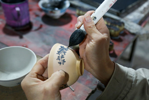 東溪窯瓷器彩繪尤為講究,紋飾有洞石花卉、纏枝菊花、山水、寒江獨(dú)釣等。 莊偉杰攝 除了堅(jiān)持傳統(tǒng),東溪窯傳統(tǒng)燒制技藝的可貴之處還在于精益求精?!懊總€(gè)環(huán)節(jié)都要下足功夫,馬虎不得,若某個(gè)環(huán)節(jié)出錯(cuò),成品很可能開(kāi)裂,就白費(fèi)功夫了?!绷挚〗榻B,以上釉為例,坯體繪飾完成后,在表面涂上一層玻璃質(zhì)的釉藥是極為重要和較難掌握的一道工序?!耙龅皆煨椭懈鱾€(gè)部分的釉層均勻一致是件不容易的事。上釉前還需用手試釉,目測(cè)釉的濃稀是否適用?!痹诹挚】磥?lái),與其他瓷器燒制相比,東溪窯傳統(tǒng)燒制技藝最大的特色是,從最初的取材到最后的出窯,每一道工序都最大程度地堅(jiān)持傳統(tǒng)并在同一條“生產(chǎn)線”完成,這在全國(guó)燒窯技藝中比較少見(jiàn)。 申遺路,見(jiàn)證窯煙重燃