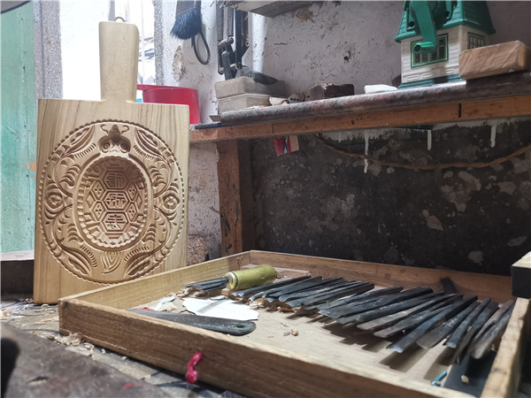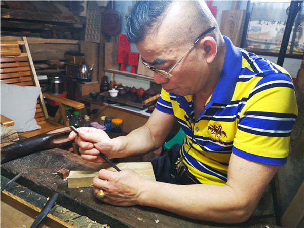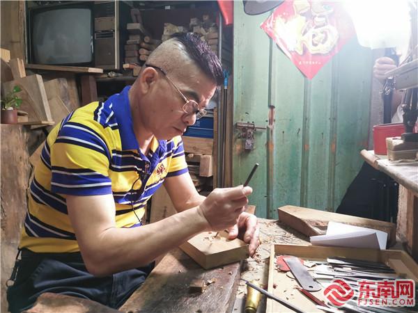 潘海員刻制龜糕印。 東南網(wǎng)記者 盧超穎 攝 潘海員的工作室位于廈門市思明區(qū)中山路南轎巷,七八平方米的屋子里擺滿了大大小小的龜糕印。在祖輩傳下來的色澤發(fā)亮的老木桌上,只見潘海員手里的刻刀上下翻飛,刀起刀落,樟木特有的清香四溢,一只活靈活現(xiàn)的“龜”就在刀下慢慢呈現(xiàn)。 潘海員祖籍安溪,他的太祖父潘儀一輩就開始從事龜糕印雕刻,祖父潘乾帶著這門手藝落戶廈門。在潘海員只有3、4歲的時(shí)候,祖父就將他帶在身邊?!盃敔斂诖锟偞е?分錢買來的12顆糖珠,只要待在他身邊,看他刻制龜糕印,就能有糖吃?!睆男〉亩δ咳竞妥娓傅难普T,讓潘海員對龜糕印有了不一樣的情感。 1979年,高中畢業(yè)的潘海員開始跟著父親專職學(xué)做龜糕印。為了讓潘海員拿穩(wěn)刻刀、扎實(shí)基礎(chǔ)功,光是打洞磨邊,父親就讓潘海員學(xué)了三年。之后的三年時(shí)間里,潘海員一邊給父親打下手,一邊學(xué)習(xí)刻制月餅?zāi)>吆妄敻庥 ?/p> “龜糕印一面是‘龜’,一面是‘壽桃’。剛開始學(xué)的時(shí)候,總是把握不住下刀的深度,常常把兩面刻穿?!敝钡?985年,潘海員才完整地刻出了人生中第一把龜糕印。 回憶起當(dāng)時(shí)的場景,潘海員眼里仍閃爍著光。潘海員說,學(xué)習(xí)刻龜糕印看起來容易,其實(shí)并不簡單。剛開始學(xué)的那幾年,手不是被木槌砸到,就是被刻刀扎傷。最多的時(shí)候,雙手被刻刀扎了十幾個(gè)洞。雖然日復(fù)一日的雕刻學(xué)起來很枯燥,但他卻從未想過放棄。 現(xiàn)在,年近六旬的潘海員仍時(shí)不時(shí)拿出他的“處女作”把玩,一邊向旁人展示,一邊笑說,“現(xiàn)在來看,當(dāng)時(shí)確實(shí)刻得十分粗糙,但我舍不得扔掉,當(dāng)時(shí)刻制完成后的自豪和成就感,我這一輩子都記得?!?/p> 固守初心 堅(jiān)持手工雕刻更有生命力