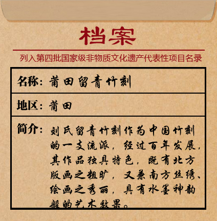 留青竹刻始創(chuàng)于唐宋,明清時(shí)期漸成為一門獨(dú)立的藝術(shù)種類。清代乾隆中期,劉氏入閩第36代裔孫劉材成創(chuàng)辦竹木雕作坊。如今,莆田留青竹刻第七代傳承人劉志高秉持古學(xué)遺風(fēng),先后在莆田建立了竹刻研究所,成立莆田雕塑學(xué)會(huì)。