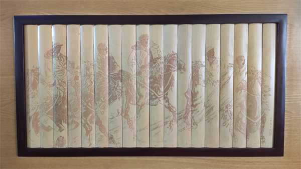 劉志高的作品《延安歲月》。受訪者供圖 “留青是利用薄似紙張的竹皮,包括竹青、竹筠、竹底的不同層次顏色表面,應(yīng)用刀法‘做文章’,表現(xiàn)筆墨、意韻和刀味。創(chuàng)造出立體與平面透視相結(jié)合的竹青層雕刻藝術(shù)形象,鏟去空白處的竹青,露出肌層作為畫面底色。由于雕刻時(shí)保留具體物象的竹青,故名留青?!眲⒅靖哒f(shuō),陷地留青則以青皮做底色主調(diào),所刻物像陷入不同纖維層間,深度和厚度可無(wú)限制放大,使色調(diào)形成鮮明的對(duì)比。 經(jīng)過(guò)百年發(fā)展,劉氏竹刻藝術(shù)形成獨(dú)特風(fēng)格,即“材盡其美、工盡其巧、器盡其雅、格盡其高”。劉志高弟子劉建新坦言,劉氏留青竹刻以往大多刻在筆筒、臂擱、鎮(zhèn)紙、折扇等文房雅玩上,受到文人青睞。創(chuàng)新后的陷地留青竹刻,在大型作品上突破了空間限制,增強(qiáng)了厚重感,可與木工藝相配置,鏤刻屏風(fēng)、插屏、掛幅之類作品。使其既有北方版畫之粗曠,又兼南方絲繡、繪畫之秀麗,具有水墨神韻般的藝術(shù)效果。 “竹皮為黃色,竹肌為紅色,歷年越久,竹皮、竹肌的色差越大,層次越豐富,視覺(jué)趣味越濃。猶如初熟之櫻桃、拋光之琥珀,頗受市民、收藏家青睞。”劉志高告訴記者。 匠心獨(dú)運(yùn) 手藝人接力傳承