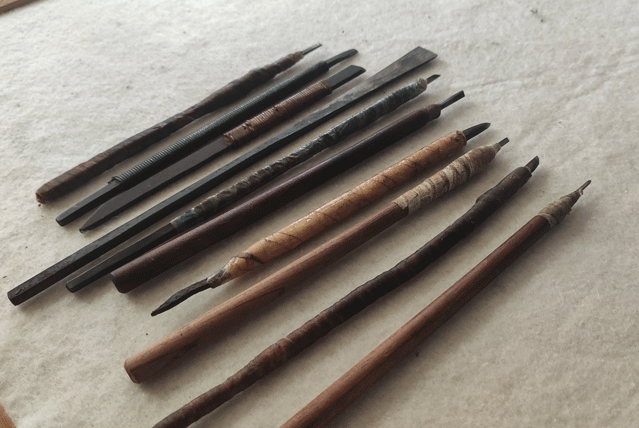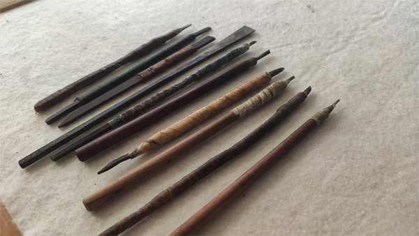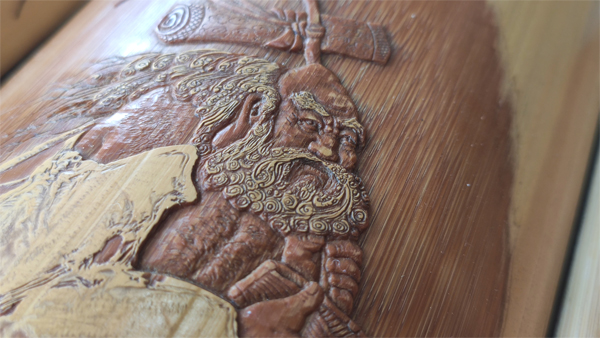 留青竹刻制作工具。東南網(wǎng)記者楊超斌 攝 在工作室里,劉志高向筆者展示了形如楔子的刀刃。他說(shuō),每次創(chuàng)作都是漫長(zhǎng)的過(guò)程,有時(shí)一天只能刻三、四個(gè)字。刻畫比刻字更復(fù)雜,用的刀具更多。有圓頭的、扁頭弧形似鏟子的,大大小小超過(guò)20把。一幅30厘米×10厘米的作品,得刻一兩個(gè)月。 刻刀掠過(guò),竹花翻卷。劉志高“刀起刀落”,技法嫻熟,將尋常的竹子化為栩栩如生的藝術(shù)作品?!傲羟嘀窨讨谱黜樞?yàn)槊璁?、割線、刮面、鏟底、采皮、挑腹、打磨等。只有沉下心來(lái),才能在竹刻技法上不斷突破,雕出精品?!?/p>