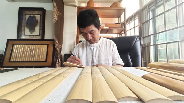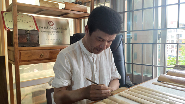 劉志高創(chuàng)作留青竹刻。東南網(wǎng)記者楊超斌 攝 莆田市地處福建中南部,竹資源豐富,為竹刻藝術(shù)創(chuàng)作提供了保障。“毛竹兩年太嫩、四年太老,三年的剛剛好?!眲⒅靖哒f(shuō),砍下毛竹后,剖成竹片,然后立即用熱水蒸煮、磨砂,做防止蟲蛀等處理,幾道工序走下來(lái),才能制成竹刻的原材料。 據(jù)記載,留青竹刻始創(chuàng)于唐宋,明清時(shí)期漸成為一門獨(dú)立的藝術(shù)種類。劉氏竹刻作為中國(guó)竹刻的一支流派,主要分布在今天的莆田。清代乾隆中期,劉氏入閩第36代裔孫劉材成創(chuàng)辦竹木雕作坊。如今,莆田留青竹刻第七代傳承人劉志高秉持古學(xué)遺風(fēng),以為學(xué)創(chuàng)新為動(dòng)力,打破家傳模式與演教授藝的傳承方法,先后在莆田建立了竹刻研究所,成立莆田雕塑學(xué)會(huì)。 據(jù)介紹,2004年至2018年間,劉志高參與非遺文化申報(bào)、保護(hù)階段的工作,以及中長(zhǎng)期十年規(guī)劃綱要大綱的可行性報(bào)告研究及編制。他自創(chuàng)的陷地留青刻在全國(guó)及世界性竹藝術(shù)交流及展演中多次獲獎(jiǎng),也成就了福建竹刻藝術(shù)在中國(guó)單項(xiàng)非遺項(xiàng)目名錄的地位。莆田劉氏竹刻因此名聲鵲起。
