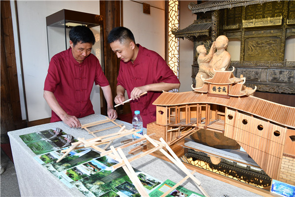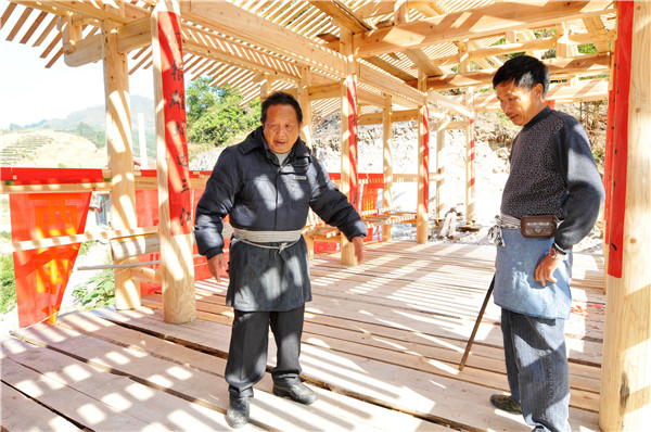 鄭多金(左)與弟弟鄭多雄在飛龍橋交流建橋經(jīng)驗(yàn)。龔健 攝 鄭多雄原本主業(yè)是一名石匠,對(duì)造木拱廊橋一竅不通。跟鄭多金學(xué)造木拱廊橋也是機(jī)緣巧合。2002年,鄭多雄跟鄭多金學(xué)習(xí)遷建芹洋鄉(xiāng)張坑、長(zhǎng)瀨溪兩座木拱廊橋回來后,他找來木工工具,每天花上八九個(gè)小時(shí)練習(xí)砍、劈、削、彈等基本功,熟記哥哥傳授的建橋工藝口訣。等基本功熟練后,他上山找來適合的木料,在哥哥的指導(dǎo)下搭建木拱廊橋模型。 在別人看來,完成這一系列工序?qū)嵲谑强菰餆o味,而鄭多雄卻持之以恒,樂此不疲。 “搭建一座木拱廊橋,需要建橋臺(tái)、測(cè)水平、立水柱架、支天門車、造拱架、上剪刀苗、橋板苗與馬腿、架橋屋等,每道工序缺一不可。剛開始每天花八九個(gè)小時(shí)制作。我印象最深的是,第一次建木拱廊橋模型,建了20來天仍然不成功。我堅(jiān)持到了一個(gè)月后才建好第一個(gè)木拱廊橋模型。為了熟練掌握技巧,我后來又多次修建了不同尺寸的模型。”鄭多雄回憶道,經(jīng)過數(shù)年的打磨鍛煉,他的木拱廊橋營造技藝也漸漸小有名氣。 “大家生活水平也慢慢提高了,來找我做木工的人也絡(luò)繹不絕?!编嵍嘈壅f,不管是修繕老木屋還是節(jié)慶所用的木質(zhì)道具,很多人找他做。 “大家對(duì)我的手藝還比較滿意?!编嵍嘈蹣沸牢康卣f,靠著一直以來堅(jiān)守的這門傳統(tǒng)手藝,他蓋起了全家人遮風(fēng)避雨的小樓,生兒育女。 數(shù)十年建橋保持初心與匠心 其實(shí),從建造石橋到木拱廊橋,這一路走來,鄭多雄從少年走到了花甲之齡,近到鄉(xiāng)里鄰居,遠(yuǎn)到閩浙交接縣市區(qū),都有他的足跡。 “每個(gè)人的內(nèi)心都像一塊木頭,想變點(diǎn)兒樣子,須得先用斧頭砍一砍,再用錐子鑿一鑿,然后用刨子刨個(gè)光,最后用砂紙打光滑?!编嵍嘈壅f,徐、鄭世家祖?zhèn)髦髂葮蛟煸勚两褚呀?jīng)第八代,“我們既然做,就有義務(wù)有責(zé)任把它做好,做出名氣,一代代傳承下去?!?/p>