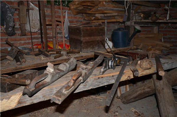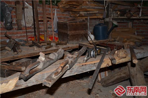 鄭多雄與兒子鄭輝明在家中交流木拱廊橋建造技藝。東南網(wǎng)記者 陳翊群 攝 在父親的言傳身教影響下,如今鄭多雄的兒子鄭輝民也加入了木工匠人的隊(duì)伍。 “現(xiàn)在需要手工家具的很少嘍,不過跟著我的這些‘老家伙’們一直沒變?!痹卩嵍嘈鄣墓ぷ魇遥浾呖吹搅死先丝谥信惆樗嗄甑摹袄霞一铩保簻y(cè)繪用的魯班尺、墨斗、規(guī),切割用的斧頭、橘子、鑿子、鏟子,打磨用的刨子、鉆、銼……在散落的木屑間,它們被整齊地碼放著。