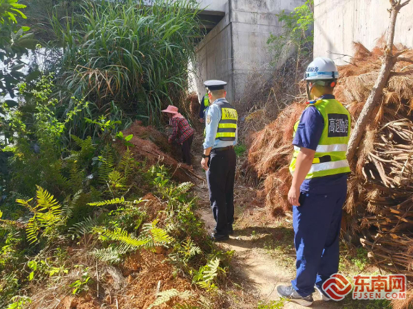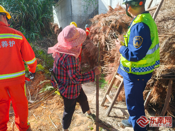 合力將堆放物進行轉(zhuǎn)移。寧德高速執(zhí)法支隊供圖 執(zhí)法人員立即尋找堆放木柴的村民,用方言對其講解《公路安全保護條例》等法條中關(guān)于橋下空間禁堆物品的規(guī)定,并展示外省橋梁火災(zāi)導(dǎo)致道路封閉的案例照片。村民從最初“橋下空地不用白不用”的抵觸情緒,逐漸轉(zhuǎn)變?yōu)槔斫庵С郑鲃优浜锨暹\工作。
