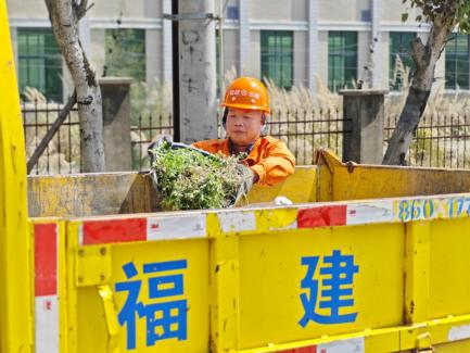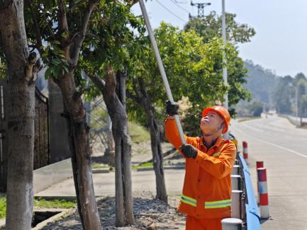 鄭文在G228線修剪路樹(連江公路中心供圖) 在巡查過程中,鄭文發(fā)現(xiàn)部分行道樹因近期雨水充沛而枝繁葉茂,已有枝條遮擋了交通標(biāo)志牌,甚至探入車道,影響通行安全。遇此情況,他沒有片刻猶豫,立即拿起修剪工具,戴好手套、系緊安全帶,麻利地開始作業(yè)?!班嵨氖?,我來吧,您歇會(huì)兒?!鄙磉叺哪贻p同事林晟見狀連忙上前勸他歇一歇。他卻只是笑著擺擺手:“我干習(xí)慣了,放心。”陽光透過樹葉灑在他的身上,那雙經(jīng)歷了歲月打磨的手,依舊穩(wěn)健有力,修剪動(dòng)作干凈利落、不留死角。排除完安全隱患后,他又背起工具,踏上下一段巡查路程,一如往昔。