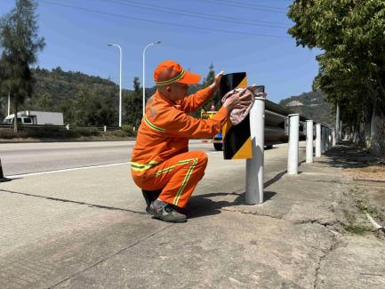 鄭文在G228線擦洗沿線設(shè)施(連江公路中心供圖) “只要路還在,就得有人守?!编嵨某_@樣說。哪怕風(fēng)雨交加,哪怕節(jié)假日當(dāng)班,只要路面有情況,他總是第一時(shí)間沖上前。2023年7月,強(qiáng)臺(tái)風(fēng)“杜蘇芮”侵襲福建,連江境內(nèi)風(fēng)雨交加,G228線浦口鎮(zhèn)官嶺村附近路段大樹倒伏,占據(jù)整個(gè)車道,造成交通中斷。災(zāi)情發(fā)生后,鄭文與同事第一時(shí)間趕赴現(xiàn)場(chǎng),在狂風(fēng)驟雨中冒雨作業(yè)。他們穿著雨衣、打著手電,將倒伏的大樹一一鋸斷、拖移、清運(yùn),一直忙到深夜才疏通道路。當(dāng)?shù)谝惠v車安全通過時(shí),鄭文摘下沾滿雨水的安全帽,那雙布滿血絲的眼睛中,閃爍著疲憊卻滿足的光芒。