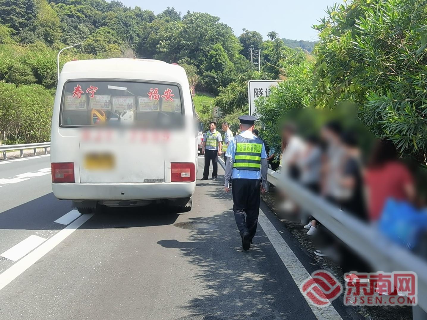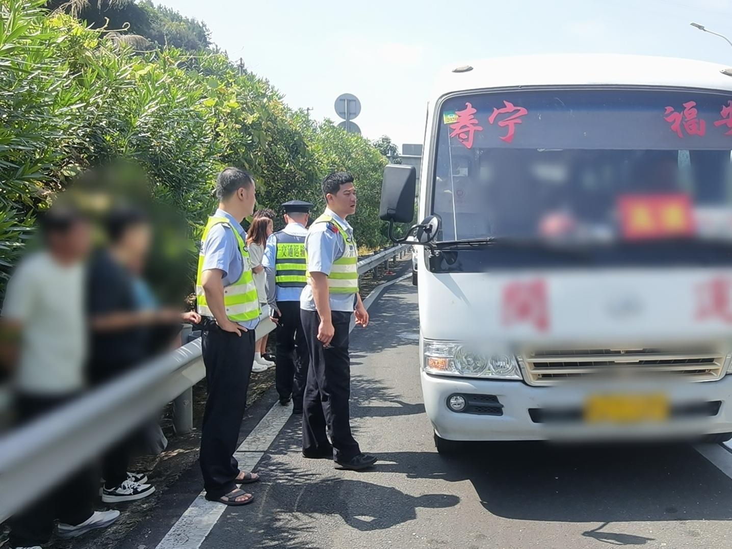 轉(zhuǎn)移群眾。寧德高速公路行政執(zhí)法支隊供圖 經(jīng)執(zhí)法人員詢問,該車從福安客運站駛往壽寧城關(guān),載有17名司乘人員,途中突發(fā)線路故障拋錨于隧道口。駕駛員未撥打道路救援電話,試圖自行排除故障,存在極大安全隱患。執(zhí)法人員聯(lián)合隨后趕到的交警,第一時間將乘客有序疏散至護欄外安全地帶。