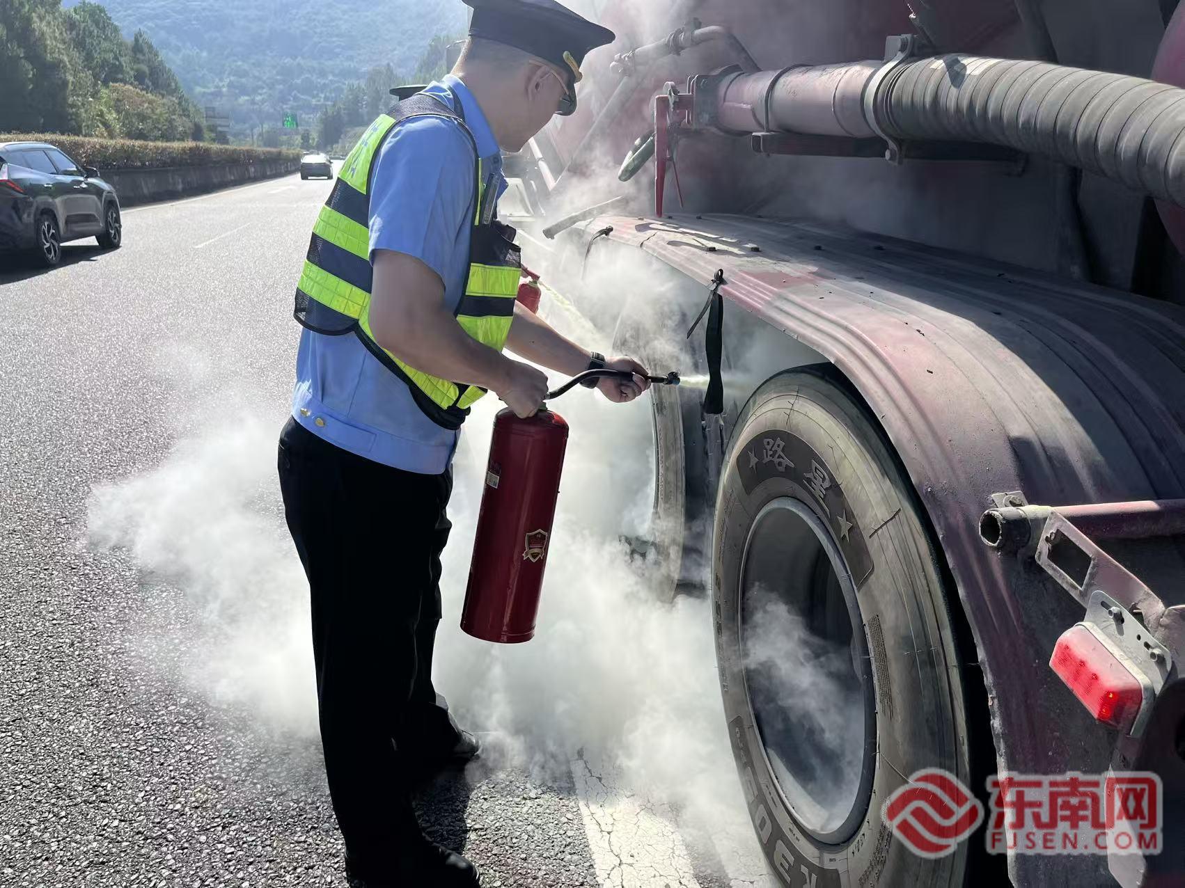 東南網(wǎng)10月9日訊(通訊員 林棟 戚盛楠)“嘭”的一聲,高速大貨車輪胎發(fā)生爆炸,黑煙沖天。10月4日9時許,寧德高速執(zhí)法支隊在京臺高速A1812+70m路段開展保暢路巡時,發(fā)現(xiàn)一輛運載水泥的貨車輪胎突發(fā)火情,現(xiàn)場濃煙伴隨明火,情況危急。
