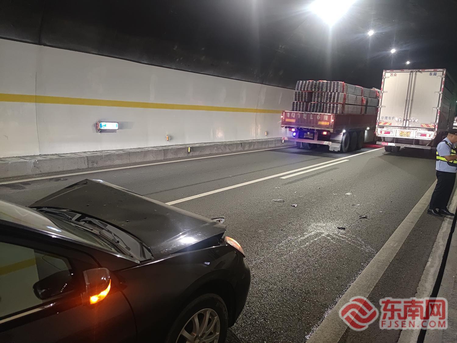 追尾事故現(xiàn)場(chǎng) 彼時(shí),崗上隧道內(nèi)車流密集,執(zhí)法員巡查至該路段時(shí),發(fā)現(xiàn)一起追尾事故。雖無人員傷亡,但受損的小轎車停滯在主車道上,極易引發(fā)因擁堵造成的二次事故。執(zhí)法員憑借敏銳的職業(yè)嗅覺和節(jié)日保暢的高度責(zé)任感,立即啟動(dòng)應(yīng)急處置措施:迅速在事故現(xiàn)場(chǎng)后方設(shè)置安全防護(hù)區(qū)域,利用警示標(biāo)志和手勢(shì)引導(dǎo)后方車流有序避讓,為事故處置筑牢安全屏障。