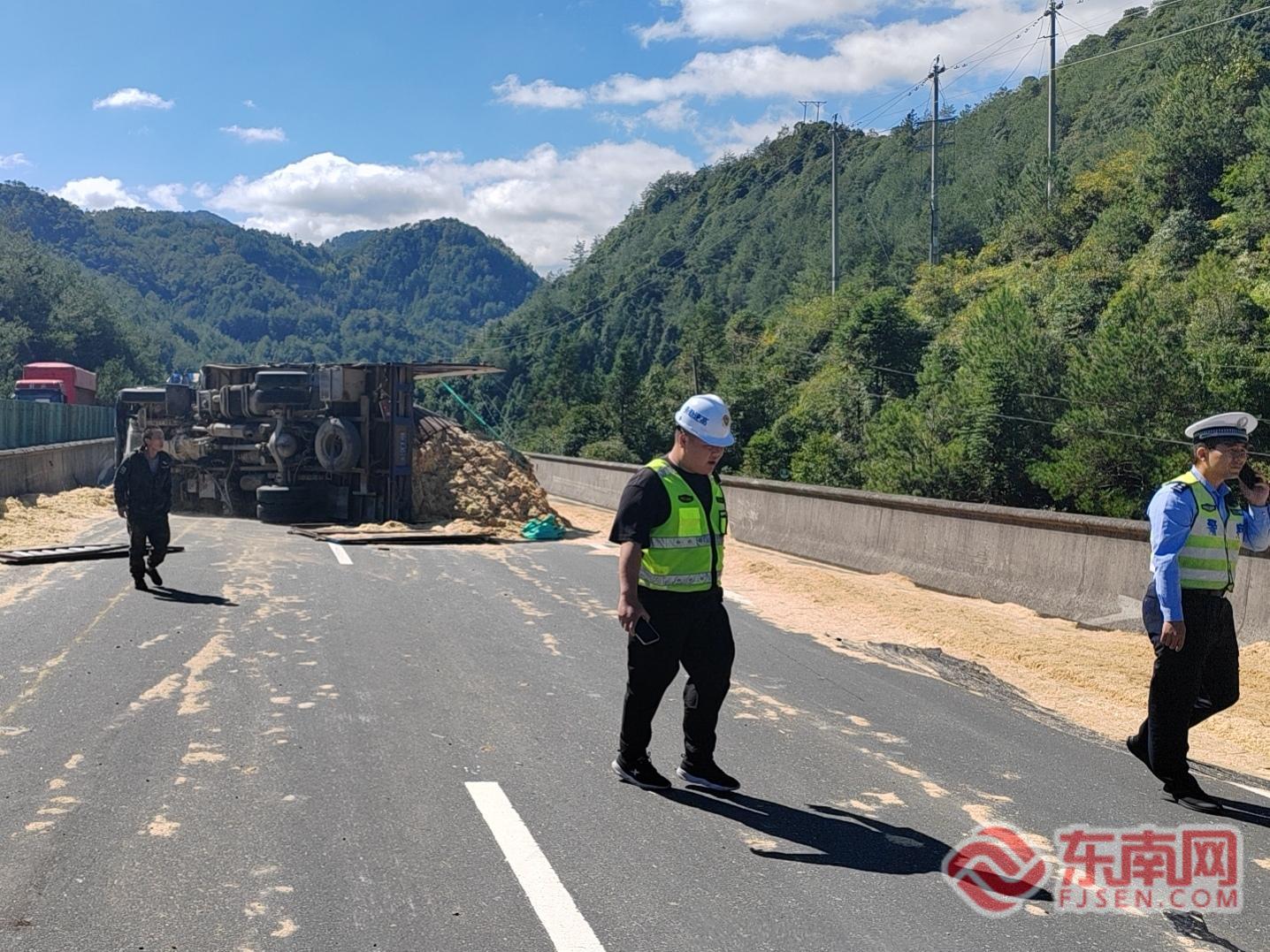 東南網(wǎng)10月24日訊(通訊員 李思澄 劉曉涌)10月23日中午,寧上高速發(fā)生一起貨車側(cè)翻事故,所載鋸粉大量傾灑,導(dǎo)致主干道通行受阻。寧德高速執(zhí)法支隊周寧中隊接警后火速出動,聯(lián)合相關(guān)部門經(jīng)過緊張?zhí)幹?,于?dāng)日15時40分成功排除險情,恢復(fù)道路正常通行。 23日12時09分,寧德高速執(zhí)法支隊周寧中隊接到報警稱:在寧上高速A83K+900處,一輛貨車發(fā)生側(cè)翻,貨物灑落主干道。中隊執(zhí)法人員聞訊立即奔赴現(xiàn)場,經(jīng)現(xiàn)場確認(rèn),側(cè)翻貨車運(yùn)載的為鋸粉,因包裝破損大面積灑落,形成安全隱患,嚴(yán)重影響交通安全。