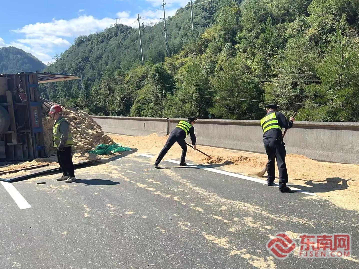 現(xiàn)場清理。寧德高速執(zhí)法支隊供圖 情況緊急,執(zhí)法人員迅速聯(lián)合現(xiàn)場路勤、交警部門啟動應(yīng)急處置預(yù)案,立即進(jìn)行安全布控和交通疏導(dǎo)。面對灑落的鋸粉,各部門人員并肩作戰(zhàn),執(zhí)法人員與現(xiàn)場工作人員一同利用鐵鍬等工具,合力將鋸粉清理出路面。為提升清理效率,現(xiàn)場后續(xù)調(diào)派挖掘機(jī)投入作業(yè)。經(jīng)過多部門連續(xù)奮戰(zhàn),至15時40分,現(xiàn)場全部清理完畢,道路恢復(fù)安全暢通。