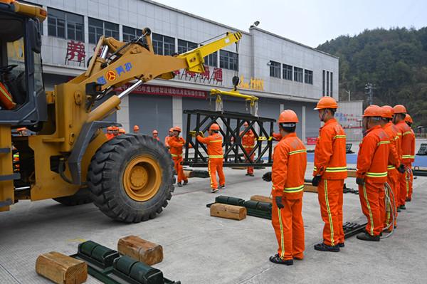 立桁架。(余建成 攝) 演練現(xiàn)場模擬了省道308線某處路段公路橋梁被毀壞,搶險人員臨時架設(shè)“321”裝配式鋼橋,保障公路暢通的過程。隨著指揮長的一聲指令,24名參演隊員迅速集結(jié),立刻抵達(dá)各自崗位投入作業(yè)?,F(xiàn)場嚴(yán)格遵循鋼橋架設(shè)技術(shù)要領(lǐng)與操作規(guī)范,在高效配合中,隊員們團結(jié)協(xié)作立桁架、搭橫梁、調(diào)整固定防風(fēng)支架、鋪設(shè)橋面蓋板……經(jīng)過1個多小時緊張作業(yè),一座長9米的鋼橋順利架設(shè)完成。技術(shù)員走上塔板,檢驗質(zhì)量合格后,多部車輛進(jìn)行試行并平穩(wěn)經(jīng)過鋼橋到達(dá)對岸,標(biāo)志著鋼橋架設(shè)圓滿成功。 近年來,三明市公路中心以實戰(zhàn)演練為抓手,通過標(biāo)準(zhǔn)化操作訓(xùn)練,強化隊伍協(xié)同作戰(zhàn)能力,不斷夯實交通戰(zhàn)備應(yīng)急保障基礎(chǔ),著力打造“平時服務(wù)、急時應(yīng)急、戰(zhàn)時應(yīng)戰(zhàn)”的專業(yè)保障力量,為轄區(qū)道路安全暢通提供堅實支撐。 |