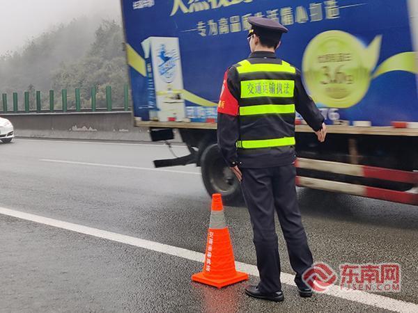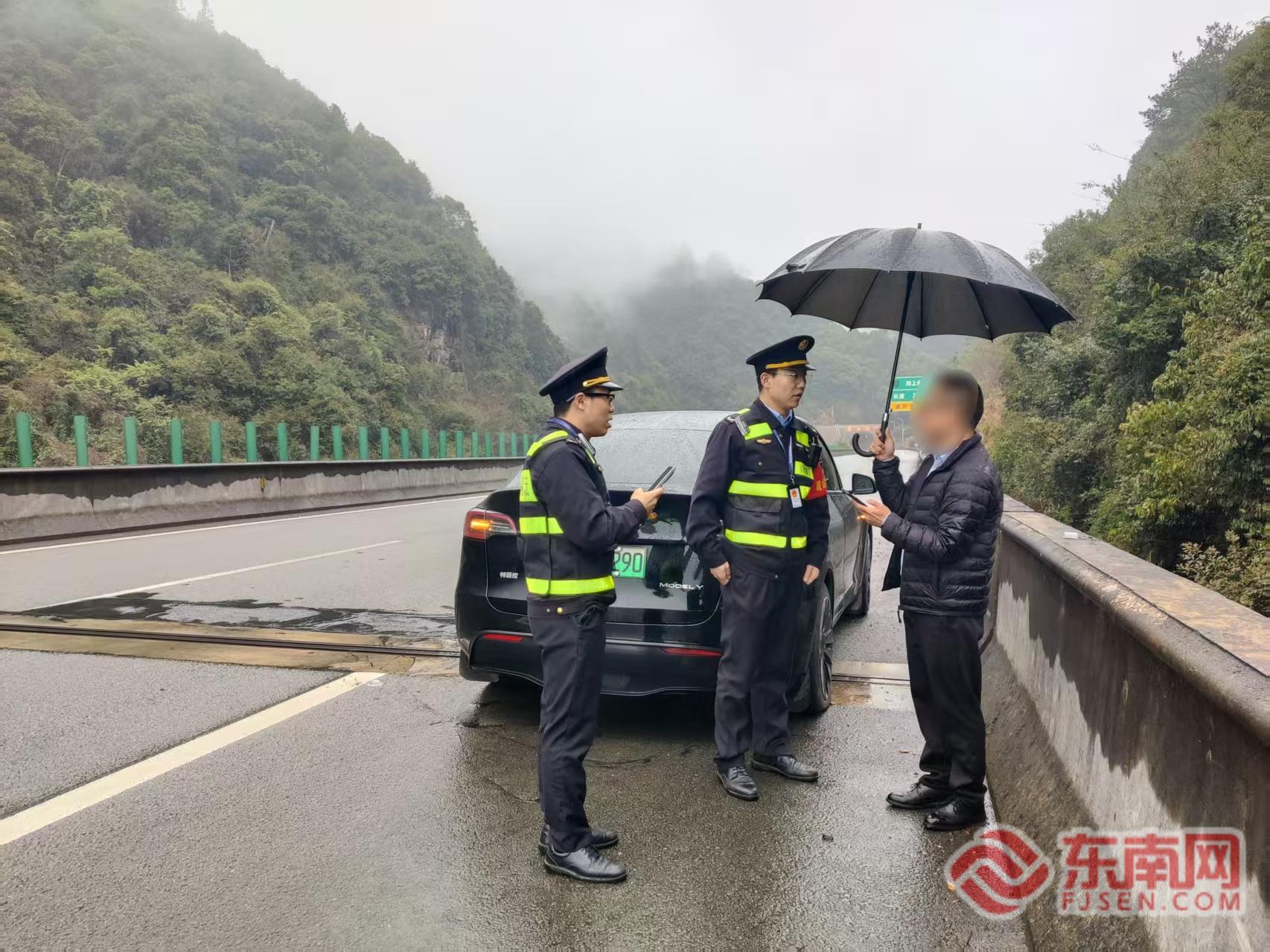 執(zhí)法人員幫助駕駛員上報信息,聯(lián)系拖車。寧德高速執(zhí)法支隊供圖 執(zhí)法人員立即停車,聯(lián)合現(xiàn)場高速交警、路勤人員迅速實施現(xiàn)場布控,將反光錐延伸至彎道入口,并指揮后方車輛提前變道,為隨后趕來的拖車施救創(chuàng)造安全空間,快速將故障車轉(zhuǎn)運到古田收費站出口送修,處置全程高效緊湊,及時恢復(fù)了道路暢通,幫助駕駛員在一小時后順利繼續(xù)返程。