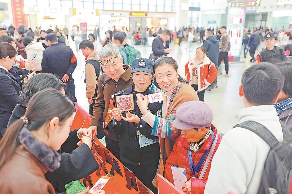 2月2日,春運首日,在福州火車站候車大廳,寫春聯(lián)、剪窗花等傳統(tǒng)民俗活動吸引不少旅客駐足參與。銀航 陳歡歡 攝