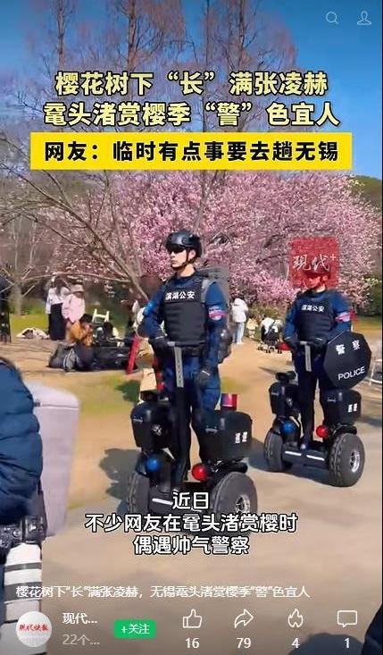 近日,江蘇無錫黿頭渚早櫻盛放,游人如織。粉色花海之中,執(zhí)勤巡邏的年輕民警身姿挺拔、神情專注,宛如春日里一道獨(dú)特的風(fēng)景。這一幕無意間在網(wǎng)絡(luò)走紅,網(wǎng)友戲稱他們“帥到人均張凌赫”,“臨時(shí)有事要去無錫”的調(diào)侃刷屏社交平臺。