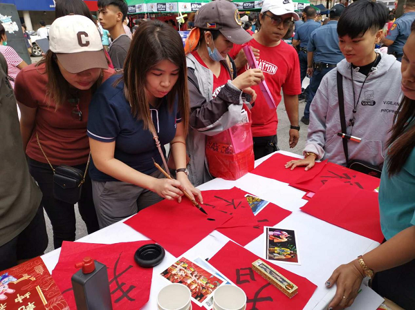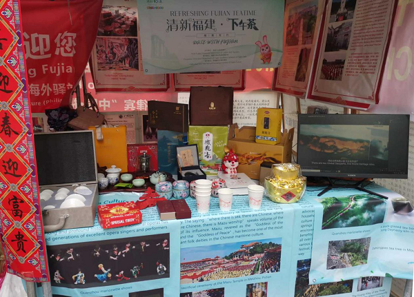 活動現(xiàn)場 現(xiàn)場播放了《福建見福》宣傳片及福建文旅推介宣傳片,展現(xiàn)了“清新福建”之美和“?!蔽幕纳詈竦滋N。福建海外文化驛站·菲律賓站的工作人員在展位擺放了筆墨紙硯、糖果、茶葉、福建明信片、“福兔”海報、春聯(lián)等,邀請當?shù)赜讶?、華僑華人體驗寫“?!彼汀案!薄懘郝?lián)、品嘗福建茶葉及福建點心,營造了歡樂喜慶、年味十足的中國春節(jié)氛圍。