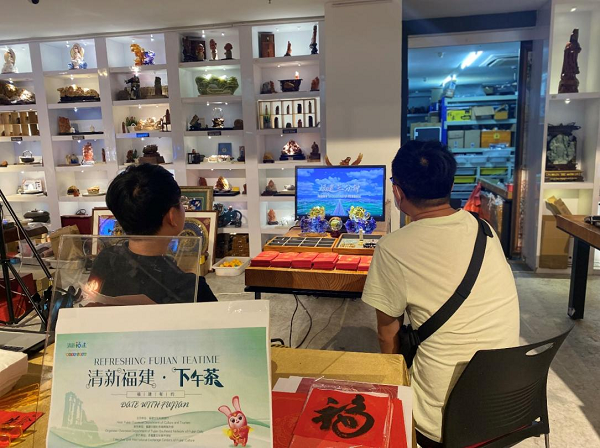現(xiàn)場展播福建文旅短片 本次活動還邀請了中國高級茶藝師汪勇向大家詳細講解品茗步驟,并介紹了來自福建不同品種的茶葉及其功效?,F(xiàn)場嘉賓們細細品嘗了產(chǎn)自福建的各式各樣茶葉,還互相交流品茶心得。