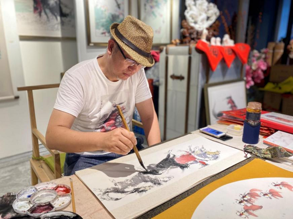 嘉賓在活動現(xiàn)場手持“?!弊趾嫌?/span> 張智棟老師現(xiàn)場創(chuàng)作中國傳統(tǒng)彩墨畫,嫻熟運用濃墨、淡墨、干墨、濕墨與焦墨等傳統(tǒng)彩墨繪畫技巧,讓筆下的幾匹駿馬活靈活現(xiàn)。他借畫的美好寓意祝福大家在新的一年里一馬當(dāng)先、馬到成功!