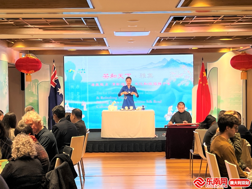 嘉賓欣賞茶藝表演。 東南網(wǎng)6月20日訊(本網(wǎng)特約記者 一禾)當(dāng)?shù)貢r(shí)間6月16日,“茶和天下·雅集”福茶品鑒專(zhuān)場(chǎng)活動(dòng)在悉尼中國(guó)文化中心舉辦,開(kāi)啟中國(guó)茶沉浸式體驗(yàn)之旅。 中國(guó)駐悉尼大使銜總領(lǐng)事周立民、副總領(lǐng)事王春生、文化參贊王書(shū)羽、教育參贊林曉青,悉尼中國(guó)文化中心主任兼中國(guó)駐悉尼旅游辦事處主任肖夏勇,福建省文化和旅游廳副廳長(zhǎng)肖長(zhǎng)培,新州前懲教部長(zhǎng)杰弗里·李,新州前上議員何沈慧霞,新州前上議員、悉尼市前副市長(zhǎng)曾筱龍,新州威樂(lè)比市議員夏毓奇,澳中友協(xié)新州分會(huì)主席瑪格麗特·凱麗以及澳友好人士、新南威爾士大學(xué)師生代表等40多人出席了活動(dòng)。肖夏勇、肖長(zhǎng)培致歡迎辭。