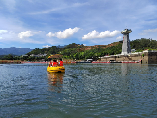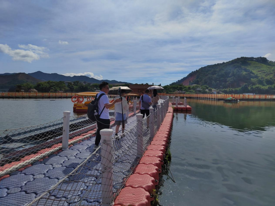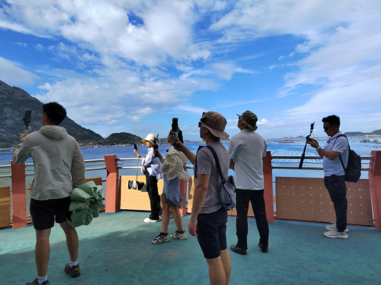 主播團(tuán)在水上觀(guān)光垂釣平臺(tái)直播 在水上觀(guān)光垂釣平臺(tái),主播們體驗(yàn)了泛江游船的樂(lè)趣?!霸谶@里可以遠(yuǎn)眺燈塔,觀(guān)賞尤墩村的全貌,還有可供垂釣的小木屋,喜歡釣魚(yú)的朋友們一定要來(lái)打卡?!睎|南網(wǎng)主播丁迅為直播間的粉絲推薦道。