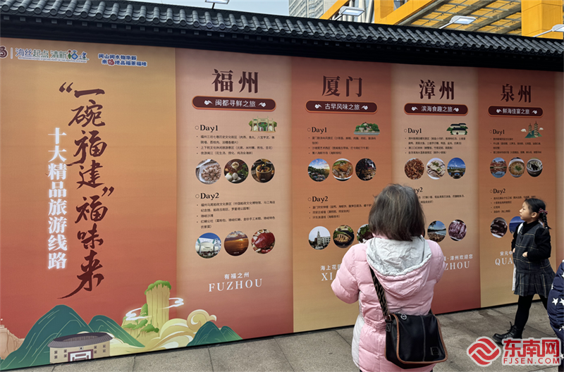美食旅游線路展板 東南網(wǎng)記者 莊宇婧 攝 活動將持續(xù)至12月29日,在此期間,福建省雜技團與歌舞劇院攜手福建各地的民間藝術大師,共同呈現(xiàn)多場視聽盛宴。 |