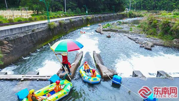 據(jù)介紹,庵杰鄉(xiāng)作為國家級生態(tài)鄉(xiāng)鎮(zhèn),依托汀江源頭天然優(yōu)勢,打造全程5公里的“天下客家第一漂”項目。項目歷經(jīng)十五個溪潭,六段險灘,四段田園風(fēng)光帶,一個溶洞,漂流全程約1.5小時左右。當日,首批體驗者乘著橡皮艇順流而下,兩岸青山如黛,碧水潺潺,沿途自然景觀引得游客驚嘆連連。沿途的專業(yè)護漂團隊,也讓游客在安全中盡享速度與激情。