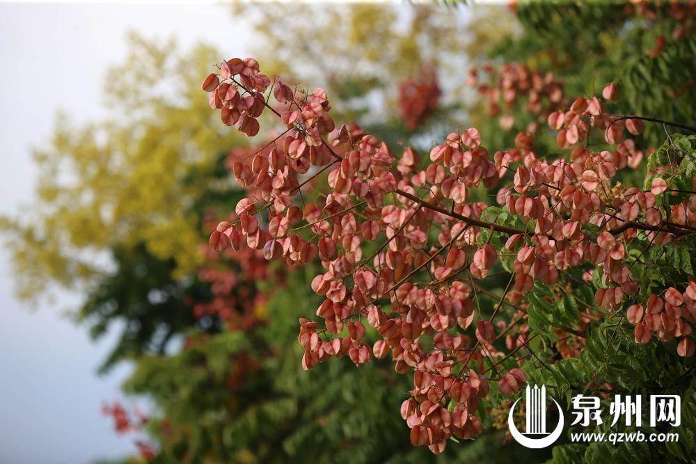 秋日里,泉州市區(qū)大坪山藏著一場不期而遇的色彩盛宴。近日,山上的五彩欒樹進入盛花期,細碎的黃花、鮮紅的果莢與翠綠的葉片交織,從山腳蔓延至山腰,宛如大自然打翻了調色盤,吸引不少市民專程登山打卡,朋友圈里滿是這片“秋日花?!钡纳碛啊?/p> 沿著大坪山健身步道向上走,未到山頂便被亮眼的色彩攔住腳步。近百株欒樹錯落分布在步道兩側,樹干筆直挺拔,抬頭望去,樹冠像撐開的巨大花傘,細碎的金黃色小花綴滿枝頭,風一吹便簌簌落下,鋪成一層“黃金地毯”。花謝后結出的三角狀果莢,初時是淡綠色,漸漸染上粉紅、朱紅,最終變成深褐色,遠遠望去,像掛在枝頭的小燈籠,又似一串串五彩鈴鐺,在陽光下泛著光澤。金黃的花簇、火紅的燈籠果與爛漫的粉霞交織碰撞,鋪展出層次豐富的秋日畫卷——抬眼望去,一層青綠、一層鵝黃、一層緋紅、一抹輕粉,它們錯落交織于山間,與山頂巍然矗立的鄭成功騎馬塑像遙相呼應,歷史的氣韻與自然的生機彼此交融。(東南早報融媒體記者 林福龍 莊麗祥 通訊員 許曉嵐 文/圖)