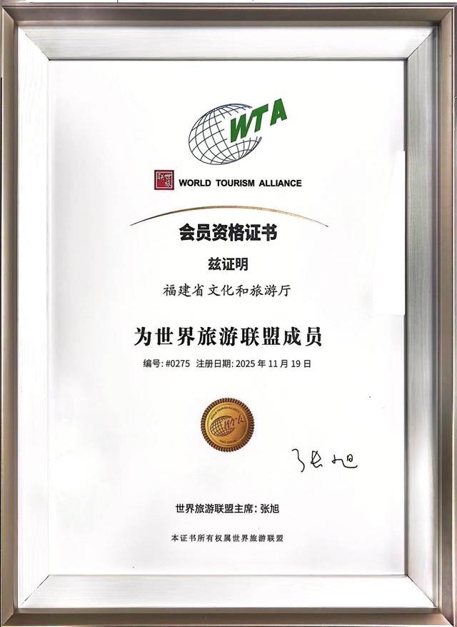 世界旅游聯(lián)盟作為全球旅游業(yè)的重要組織,肩負(fù)旅游促進(jìn)和平、旅游促進(jìn)發(fā)展、旅游促進(jìn)減貧的使命,致力于深化國際旅游交流與合作,推動全球旅游業(yè)互聯(lián)互通和共享共治,促進(jìn)全球旅游業(yè)可持續(xù)發(fā)展。此次年會審議通過了來自中國、土耳其、阿聯(lián)酋、肯尼亞等7個國家和地區(qū)的15家機(jī)構(gòu)加入聯(lián)盟。新會員涵蓋社會組織、城市和企業(yè)三大類別,福建省文化和旅游廳與澳門休閑旅游服務(wù)創(chuàng)新協(xié)會、土耳其旅游促進(jìn)和發(fā)展局等7家單位共同入選社會組織類會員。省文旅廳副廳長肖長培上臺獲頒會員證書。 福建省山海交融、人文薈萃,素有“山海畫廊、人間福地”的美譽(yù),森林覆蓋率連續(xù)46年位列全國首位,是中國大陸最綠的省份,水、大氣、生態(tài)環(huán)境連年保持全優(yōu),是中國東南沿海的一顆璀璨明珠。擁有武夷山、福建土樓、(泰寧)丹霞、鼓浪嶼:歷史國際社區(qū)、“泉州:宋元中國的世界海洋商貿(mào)中心”等5處世界遺產(chǎn),南音、媽祖信俗等10項(xiàng)人類非物質(zhì)文化遺產(chǎn)名錄,位居全國前列。海絲文化、閩南文化、客家文化、茶文化、媽祖文化、朱子文化、閩都文化、船政文化等地域特色鮮明,官洋村是2025年“世界最佳旅游鄉(xiāng)村”,首屆“東亞文化之都”泉州市近日又獲得“世界美食之都”殊榮。