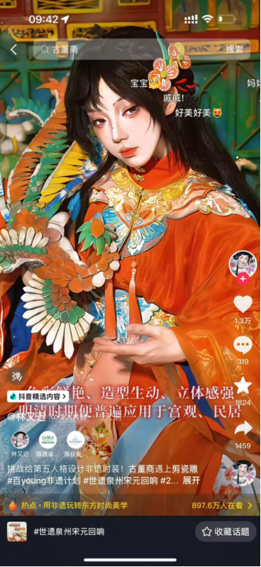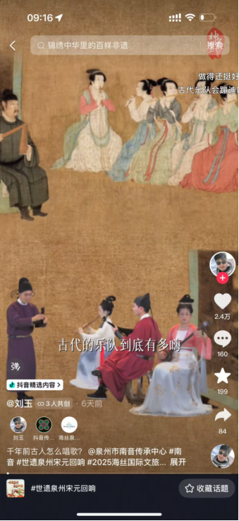 在抖音平臺(tái)的300多個(gè)短視頻作品中,泉州非遺不再是博物館中的標(biāo)本,而是化身可體驗(yàn)、可傳播的“生活美學(xué)”。創(chuàng)新文旅推介,講好泉州故事,以文塑旅,以旅彰文。要讓泉州成為全國(guó)最具煙火氣的旅游城市、世界海絲多元文化旅游目的地,講好泉州故事是一條重要路徑。 本月“泉州世遺宋元回響”話題的火熱,也離不開達(dá)人們?cè)谖穆猛平樯系膭?chuàng)新。不少達(dá)人借助AI人工智能手段,還原泉州的千年歷史。來(lái)自四川的傳統(tǒng)文化創(chuàng)作者劉玉,擁有485萬(wàn)粉絲,他在泉州市南音傳承中心體驗(yàn)學(xué)習(xí)南音。以我國(guó)十大名畫《韓熙載夜宴圖》為切入點(diǎn),特地為畫中場(chǎng)景編曲,讓名畫“活”起來(lái)。他的短視頻,不僅讓百萬(wàn)網(wǎng)友看見(jiàn)古人生活?yuàn)蕵?lè)場(chǎng)景,而且也深入挖掘千年南音文化價(jià)值。
