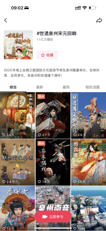 12月9日至15日,由文化和旅游部、福建省人民政府共同主辦,福建省文旅廳與泉州市人民政府承辦的2025年海上絲綢之路國(guó)際文化旅游節(jié)在泉州盛大舉行。抖音聯(lián)合泉州市委網(wǎng)信辦發(fā)起話題#泉州世遺宋元回響,邀請(qǐng)來(lái)自全國(guó)各地的抖音優(yōu)質(zhì)創(chuàng)作者,圍繞非遺主題展開創(chuàng)作,并與福建省文旅廳、泉州市文旅局等深入聯(lián)動(dòng),讓網(wǎng)友在掌上云端,沉浸式體驗(yàn)泉州獨(dú)特的海絲文化和閩南文化。 抖音達(dá)人加持,曝光總量破億:泉山晉水之間,人文珍寶薈萃。作為海上絲綢之路的重要節(jié)點(diǎn)城市,泉州以其獨(dú)特的“宋元中國(guó)的世界海洋商貿(mào)中心”文化底蘊(yùn),吸引了全球的目光。2025年海上絲綢之路國(guó)際文化旅游節(jié),以“絲路交響·融通世界”為主題,精心策劃了“非遺煥新”“四海和鳴”“國(guó)潮消費(fèi)”三大板塊共10項(xiàng)主要活動(dòng),吸引48個(gè)國(guó)家和地區(qū)、35個(gè)演藝團(tuán)隊(duì)、非遺展演團(tuán)隊(duì)、近2000名海內(nèi)外賓朋齊聚泉州,將構(gòu)建國(guó)際化多元交流平臺(tái),呈現(xiàn)一場(chǎng)全球共享、全民參與的國(guó)際文旅盛會(huì)。本場(chǎng)文旅盛宴與達(dá)人傳播形成合力,讓“泉州世遺宋元回響”這個(gè)充滿號(hào)召力的話題持續(xù)升溫。截至12月17日,共有347多位達(dá)人在抖音平臺(tái)參與話題創(chuàng)作,其中不乏17位抖音優(yōu)質(zhì)創(chuàng)作者,其話題曝光總量超1億。