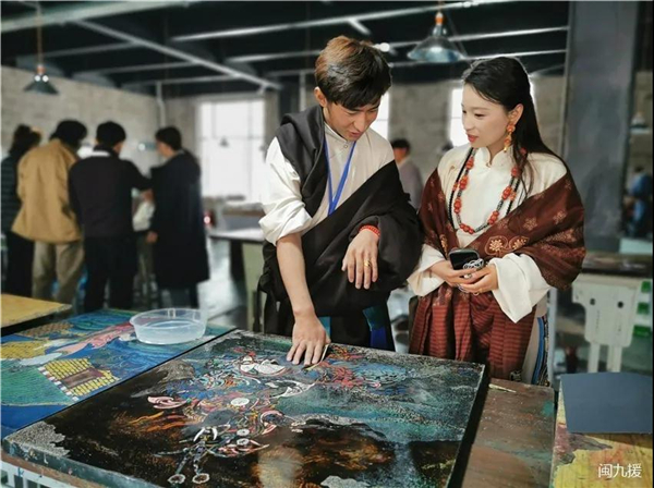 此次直播采取福州昌都兩地連線方式,福建和西藏藝術(shù)家同步出鏡介紹唐卡漆畫的藝術(shù)之美,呈現(xiàn)新鮮出爐的唐卡漆畫作品,讓更多觀眾認(rèn)識唐卡漆畫,了解福建藝術(shù)扶貧工程,見證藝術(shù)超越時空的碰撞與新生。 在西藏昌都康巴文化產(chǎn)業(yè)園,福建省藝術(shù)館領(lǐng)導(dǎo)、昌都文化局領(lǐng)導(dǎo)帶領(lǐng)大家參觀唐卡漆畫培訓(xùn)現(xiàn)場,看學(xué)員們現(xiàn)場作畫,欣賞學(xué)員作品,并介紹唐卡漆畫培訓(xùn)班背景意義、現(xiàn)有規(guī)模、發(fā)展前景,還有培訓(xùn)班學(xué)員暢談學(xué)習(xí)感受。