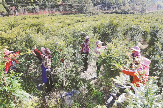 12月12日,在位于明溪縣夏陽(yáng)鄉(xiāng)紫云村的紫杉園“南方紅豆杉一號(hào)”苗木種植基地內(nèi),30多位村民正在剪紅豆杉苗木枝葉。紫杉園公司是明溪縣生物醫(yī)藥產(chǎn)業(yè)項(xiàng)目之一,紅豆杉是提煉抗腫瘤原料藥紫杉醇的原材料,“南方一號(hào)”紫杉醇含量比普通紅豆杉高出10倍以上。2016年,公司流轉(zhuǎn)閑置土地1600余畝,連片種植紅豆杉,通過(guò)“公司+基地+農(nóng)戶”模式,為紫云村提供80多個(gè)務(wù)工崗位,助力公司、村民、村財(cái)三增收。 |