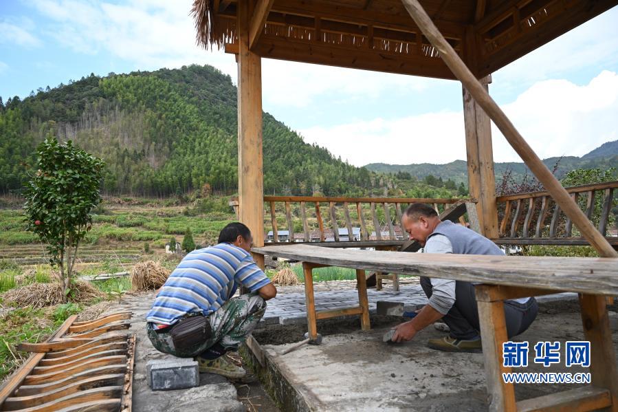 11月19日,嶺下村村民在維修村里的涼亭。新華社記者姜克紅 攝