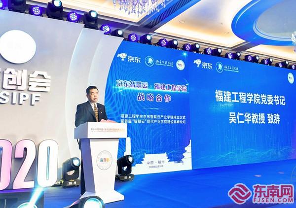吳仁華致辭。東南網(wǎng)記者 陳楠 攝 東南網(wǎng)12月10日訊(本網(wǎng)記者 陳楠)今天上午,作為第十八屆“海創(chuàng)會(huì)”配套活動(dòng)的福建工程學(xué)院京東智聯(lián)云產(chǎn)業(yè)學(xué)院成立儀式暨首屆“智聯(lián)云”現(xiàn)代產(chǎn)業(yè)學(xué)院建設(shè)高峰論壇在福州市開(kāi)幕。 記者在會(huì)上獲悉,此次雙方聯(lián)合成立的福建工程學(xué)院京東智聯(lián)云產(chǎn)業(yè)學(xué)院將致力于開(kāi)展產(chǎn)教融合創(chuàng)新示范,在電商、貿(mào)易、物流供應(yīng)鏈、人工智能等領(lǐng)域建立長(zhǎng)效穩(wěn)固的合作機(jī)制,加快福建省該領(lǐng)域應(yīng)用型人才培養(yǎng)。學(xué)院依托于互聯(lián)網(wǎng)經(jīng)貿(mào)學(xué)院,開(kāi)設(shè)電子商務(wù)行業(yè)工程師實(shí)驗(yàn)班,并整合線下線上教學(xué)資源等多種教學(xué)模式。目前學(xué)院現(xiàn)有富民云咖新媒體產(chǎn)教融合基地、互聯(lián)網(wǎng)創(chuàng)客中心等校內(nèi)實(shí)踐平臺(tái),以及可利用的京東(福清)電商產(chǎn)業(yè)園、京東(仙游)數(shù)字經(jīng)濟(jì)產(chǎn)業(yè)園、京東(廈門(mén))電子商務(wù)產(chǎn)業(yè)園等多個(gè)省內(nèi)實(shí)踐平臺(tái),引入產(chǎn)業(yè)知識(shí)與技能入課堂,打造理論與實(shí)踐無(wú)縫對(duì)接的學(xué)習(xí)模式。