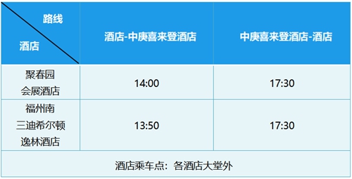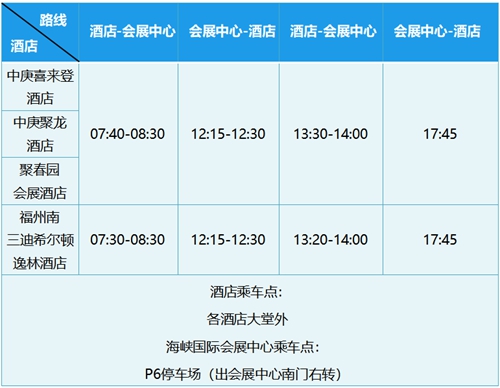 3.3 會間接駁 4月25日至4月26日,為保障參會嘉賓按時參會,將安排各指定酒店至?xí)龅亩c往返班車。 ● 4月25日海峽國際會展中心接駁安排