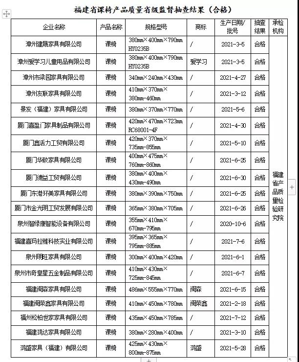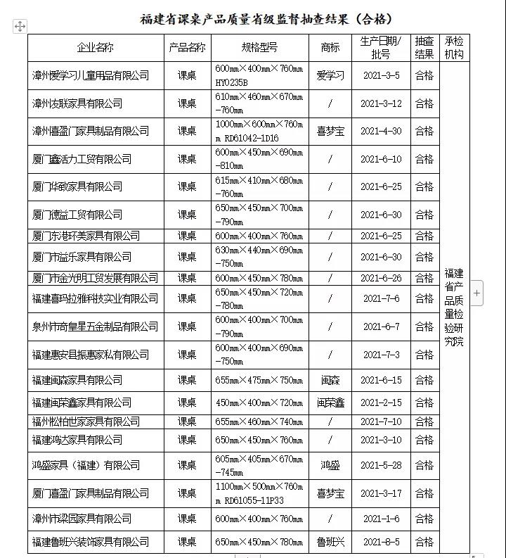 近期,依據(jù)《中華人民共和國產(chǎn)品質(zhì)量法》,福建省市場監(jiān)督管理局組織對生產(chǎn)領(lǐng)域課桌、課椅開展產(chǎn)品質(zhì)量省級監(jiān)督抽查,共抽查20家課桌生產(chǎn)企業(yè)20批次產(chǎn)品和20家課椅生產(chǎn)企業(yè)20批次產(chǎn)品,合格率為100%。 本次抽查依據(jù)QB/T 4071-2010 《課桌椅》標(biāo)準(zhǔn)的要求,對課桌產(chǎn)品安全性、桌面垂直靜載荷、桌面垂直耐久性、桌面垂直沖擊、桌腿跌落、桌面水平靜載荷、重金屬含量(限色漆)、甲醛釋放量等8個項(xiàng)目進(jìn)行了檢驗(yàn);對課椅產(chǎn)品安全性、椅子向前傾翻、椅子側(cè)向傾翻(有扶手和無扶手)、椅子向后傾翻、凳子任意方向傾翻、座面椅背聯(lián)合靜載荷、座面?zhèn)认蜢o載荷、椅腿向前靜載荷、椅腿側(cè)向靜載荷、座面沖擊、椅背沖擊、踏腳靜載荷、椅腿跌落、枕靠側(cè)向靜載荷、扶手側(cè)向靜載荷、重金屬含量(限色漆)、甲醛釋放量等17個項(xiàng)目進(jìn)行了檢驗(yàn)。抽查發(fā)現(xiàn)40批次產(chǎn)品均符合標(biāo)準(zhǔn)的規(guī)定。 根據(jù)《產(chǎn)品質(zhì)量監(jiān)督抽查管理暫行辦法》(國家市場監(jiān)督管理總局第18號令)規(guī)定,現(xiàn)將抽查結(jié)果予以公告。 合格產(chǎn)品信息