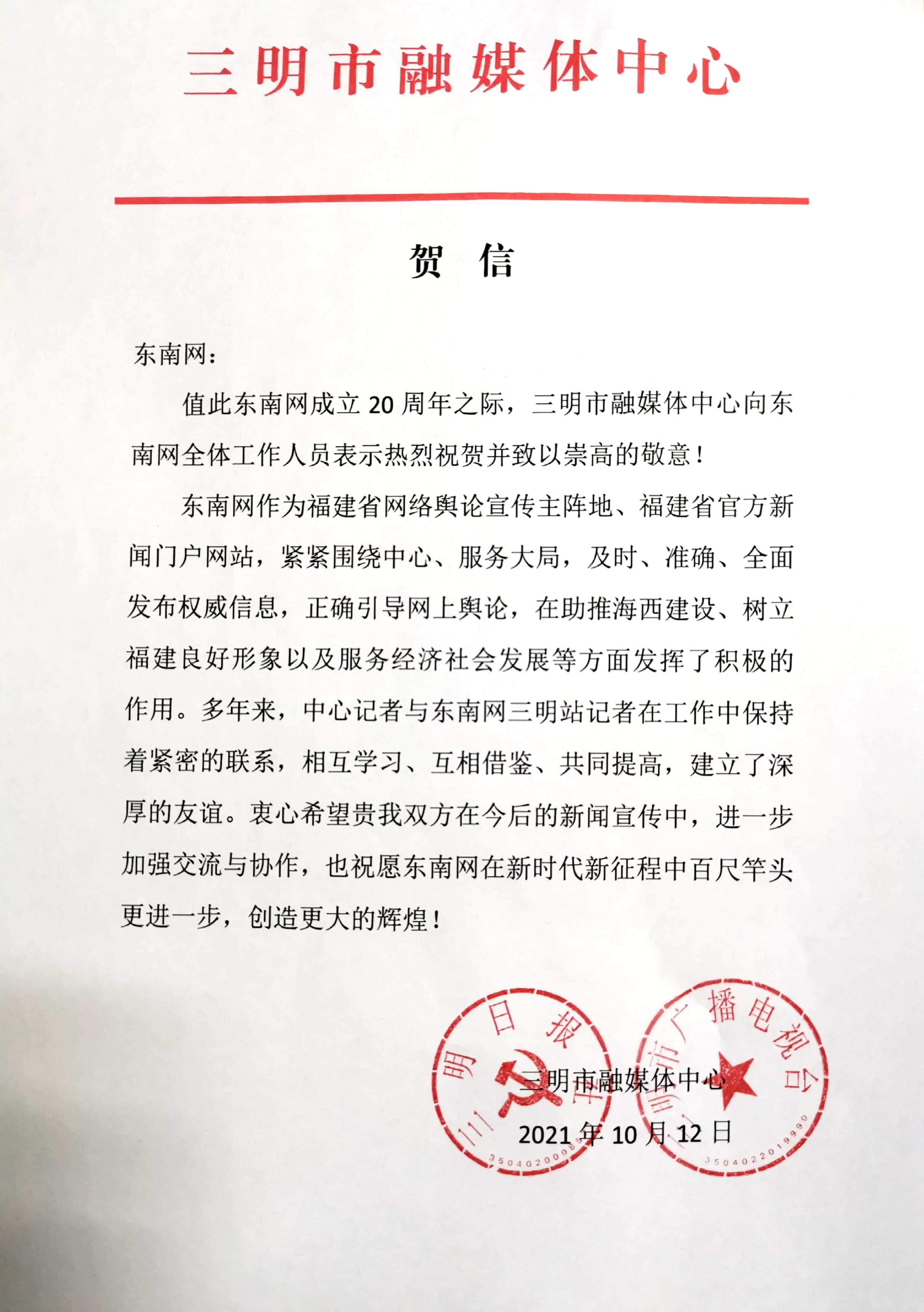 三明市融媒體中心賀信