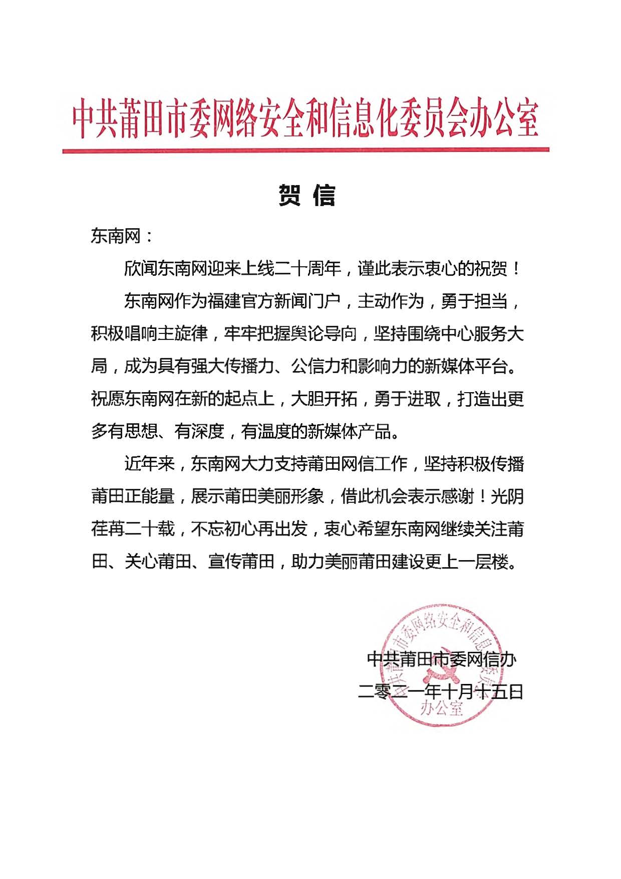 中共莆田市委網(wǎng)絡安全和信息化委員會辦公室賀信