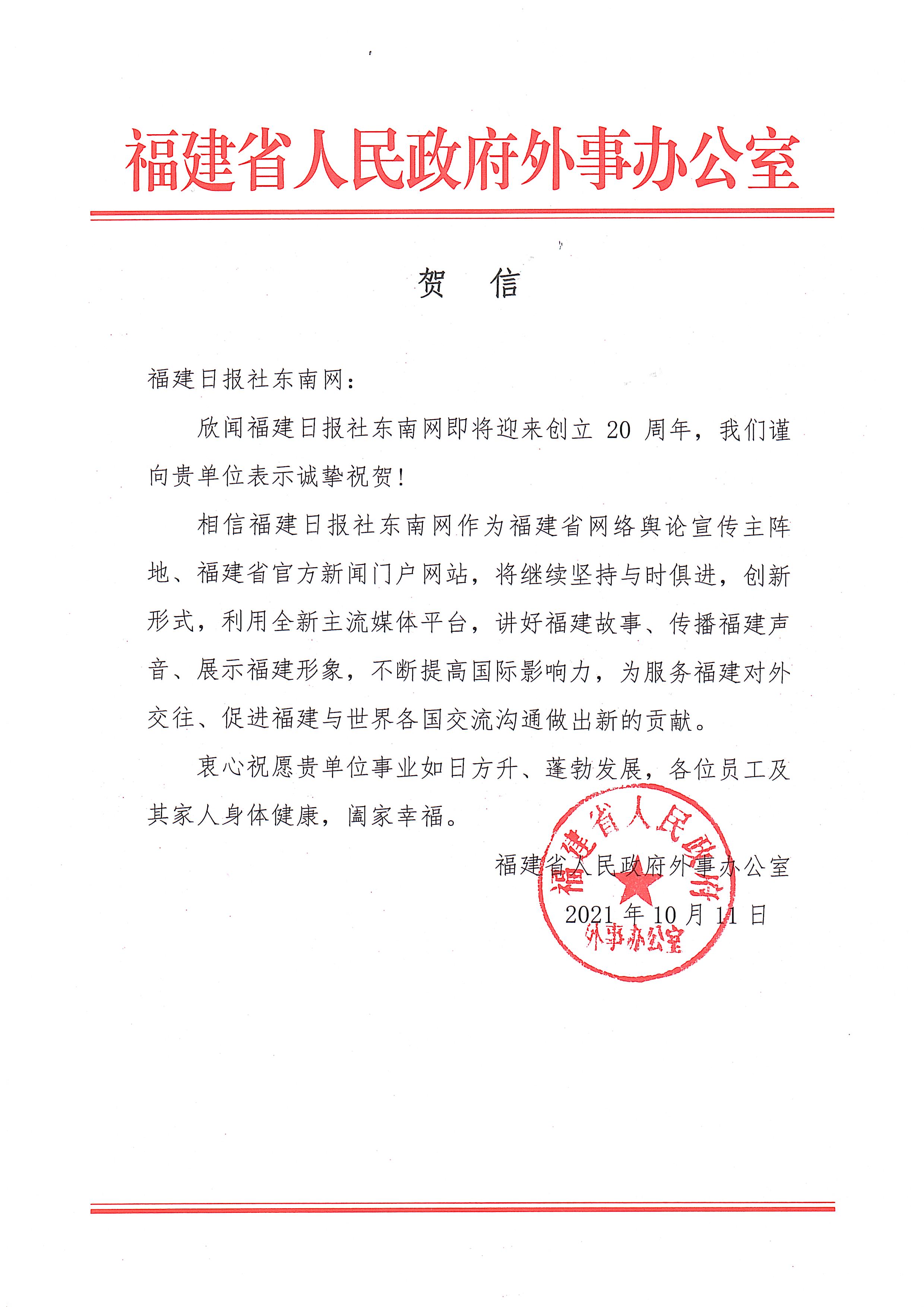 福建省人民政府外事辦公室賀信