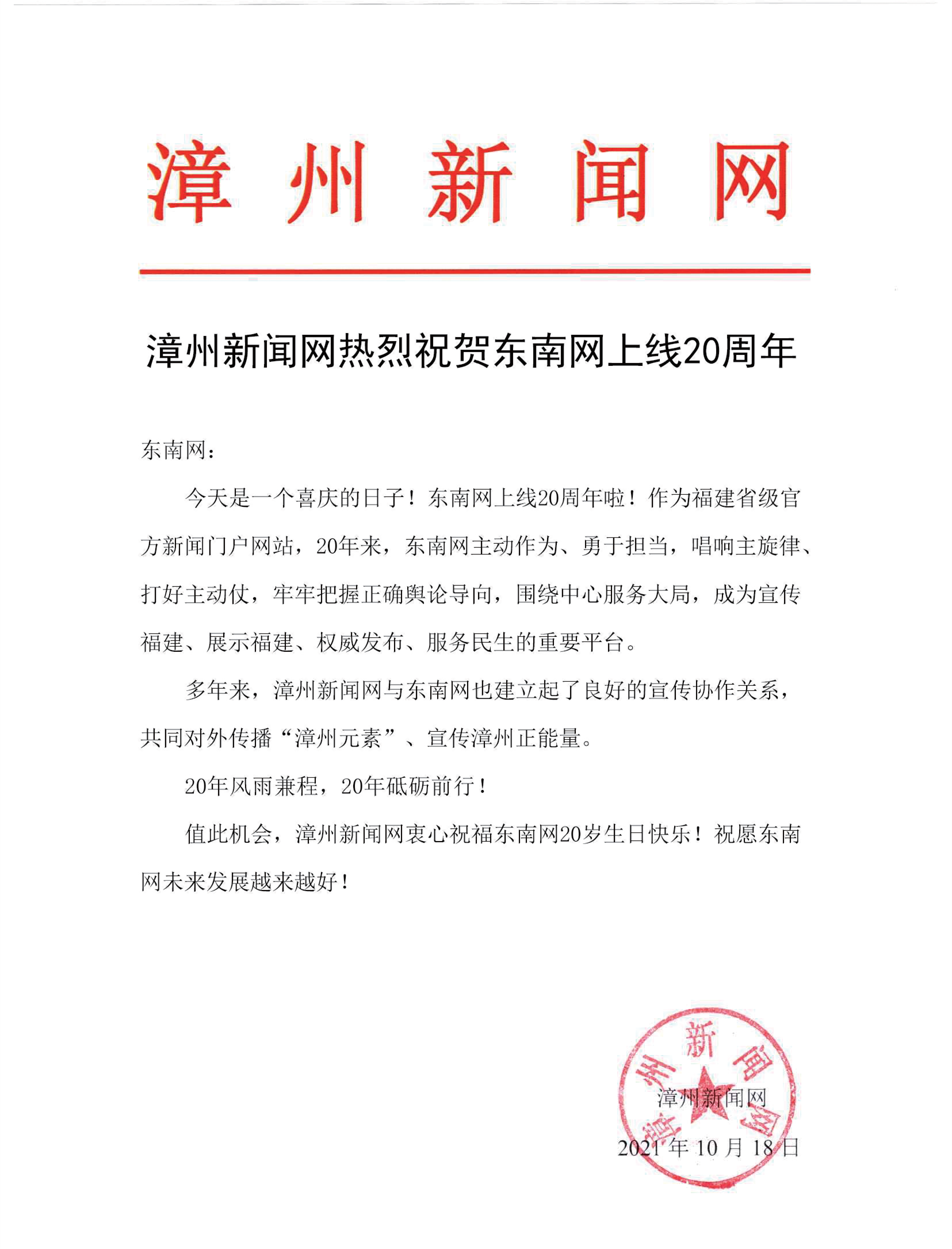 漳州新聞網(wǎng)賀信