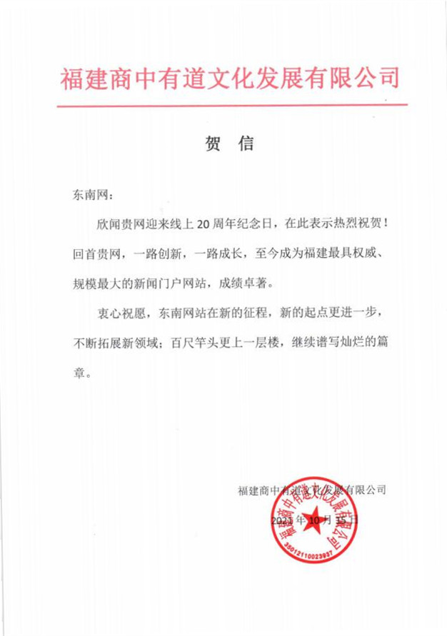 福建商中有道文化發(fā)展有限公司賀信