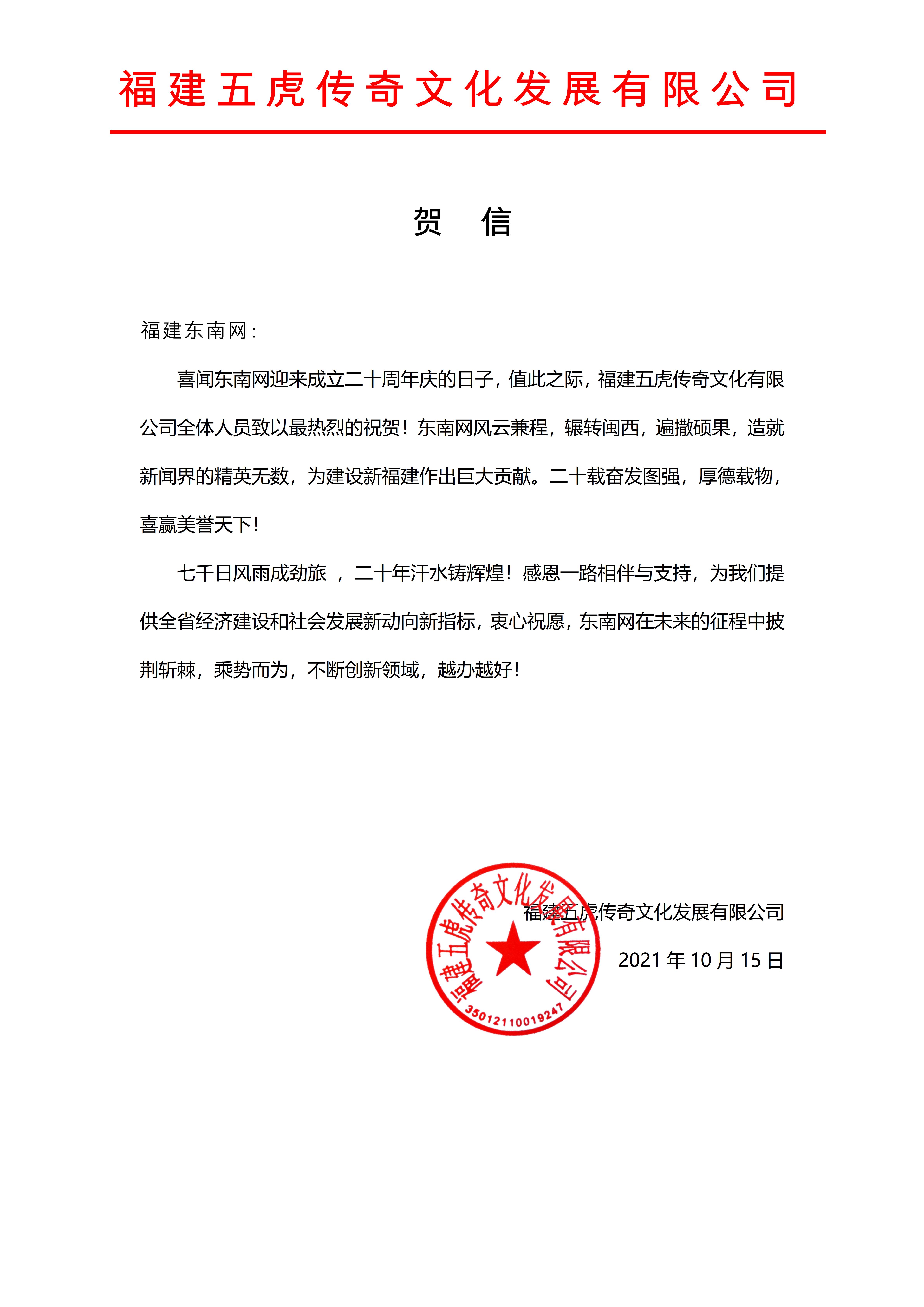 福建五虎傳奇文化發(fā)展有限公司賀信