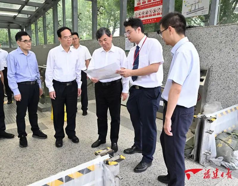 27日,周祖翼在福州地鐵一號(hào)線樹(shù)兜站檢查防臺(tái)風(fēng)工作。 受臺(tái)風(fēng)外圍環(huán)流影響,榕城風(fēng)雨逐漸增強(qiáng)。風(fēng)雨來(lái)襲時(shí),福州交通、市政、城建、電力等各部門(mén)的干部職工堅(jiān)守崗位,努力守護(hù)萬(wàn)家平安。地鐵作為城市公共交通的主動(dòng)脈,是迎戰(zhàn)臺(tái)風(fēng)的重要一環(huán)。周祖翼一行來(lái)到地鐵一號(hào)線樹(shù)兜站口,看到一包包防汛沙袋和防洪擋板已移至出入口通道、貼墻整齊擺放,他詳細(xì)向站點(diǎn)負(fù)責(zé)同志了解防臺(tái)風(fēng)預(yù)案、物資配備、應(yīng)急演練等情況,并察看了車(chē)站控制室,叮囑他們要根據(jù)臺(tái)風(fēng)影響程度及時(shí)采取相應(yīng)的措施,加強(qiáng)安全檢查巡查,確保地鐵運(yùn)營(yíng)及乘客出行安全。在低洼易澇點(diǎn)福飛北路下穿通道,“龍吸水”等大流量移動(dòng)排水泵車(chē)已經(jīng)到位。周祖翼走進(jìn)雨水泵站了解防澇應(yīng)急方案,與正在備戰(zhàn)的搶險(xiǎn)人員握手交流,要求提前合理預(yù)置排澇設(shè)備,做到第一時(shí)間搶排積水,防止城市內(nèi)澇。周祖翼一行冒雨走進(jìn)琴亭湖公園及其泵站,了解琴亭湖蓄洪防洪功能,認(rèn)真詢問(wèn)當(dāng)前水位,提醒有關(guān)負(fù)責(zé)同志對(duì)城區(qū)主要水體要提前調(diào)蓄、降低水位,騰出庫(kù)容應(yīng)對(duì)臺(tái)風(fēng)可能帶來(lái)的強(qiáng)降雨。福州主城區(qū)的積水主要通過(guò)管網(wǎng)流入內(nèi)河、再經(jīng)排澇站排入閩江。周祖翼來(lái)到晉安河、光明港水系的重要排澇出口魁岐排澇站,詳細(xì)了解城區(qū)排水防澇主通道調(diào)度以及人員、設(shè)施配備情況,并察看了城市排水應(yīng)急救援基地。他感謝大家的辛勤付出,并要求福州市充分用好水閘和排澇站,科學(xué)精確調(diào)度,確保排水暢通。