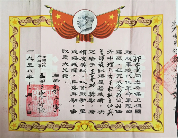 郭學(xué)瀛入選的紅色珍藏品《金門戰(zhàn)役三等功獎狀》,彰顯了人民軍隊無畏勇毅、浴血奮戰(zhàn)、視死如歸的軍人本色和革命英雄主義精神。